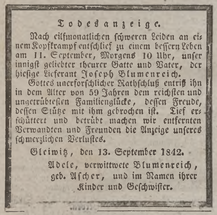 Josef Blumenreich zmarł w Gliwicach 11 września 1842 roku, jego pogrzeb odbył się kolejnego dnia.